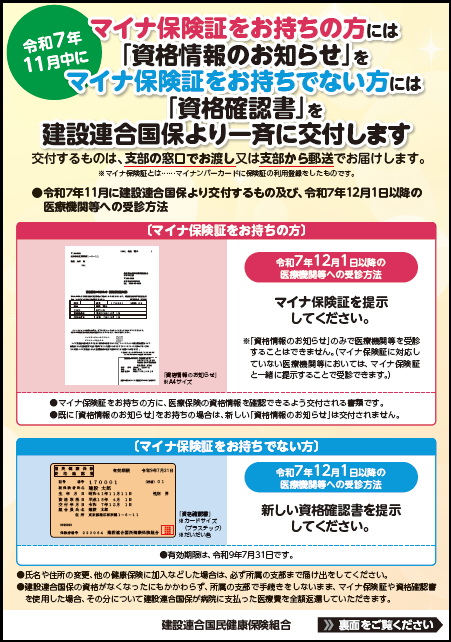 令和7年12月1日から使用するものとして、マイナ保険証をお持ちの方には「資格情報のお知らせ」を、マイナ保険証をお持ちでない方には「資格確認書」を、令和7年11月中に建設連合国保より一斉に交付します。