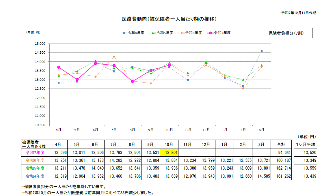 令和7年10月の組合員及び家族一人当たりの医療費をご覧ください。(画像をクリックすると拡大します)